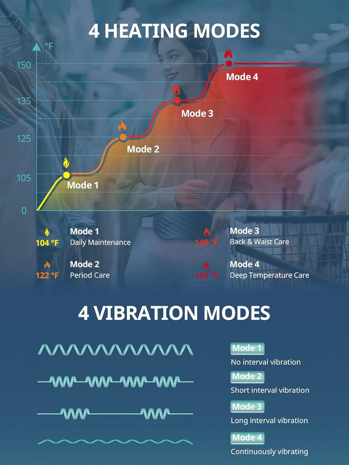 Answer 1: The smart AI temperature control feature allows you to choose from four precise heat settings: 104°F, 122°F, 133°F, and 149°F. This customization enables you to adjust the warmth to meet your individual comfort needs, providing tailored relief from menstrual cramps and abdominal pain.